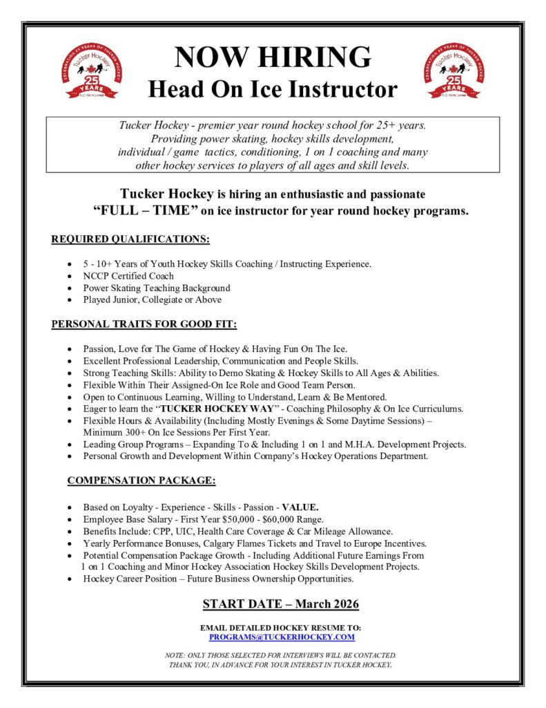 Send Hockey Resumes to: programs@tuckerhockey.com and indicate desired on ice instructor position.