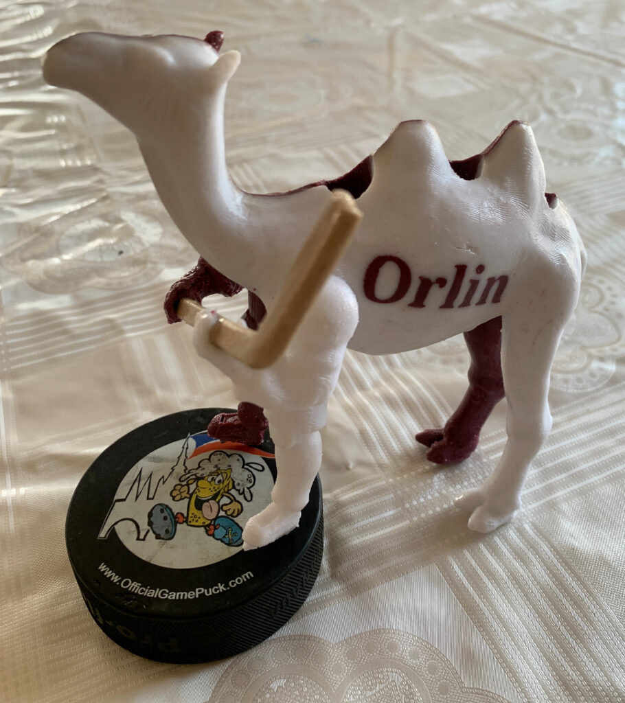 • First photo – A 3D printed “Orlin” depicted as a hockey playing Camel given to him when I left Qatar.