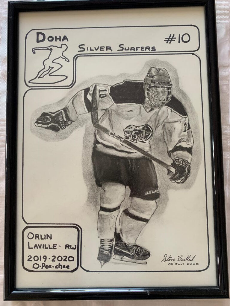 • Center photo – A hand drawn pencil “hockey card” (from photo) by a very good friend of Orlin (Steve Bulteal)